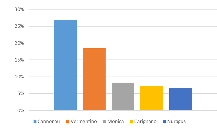Behind them, Monica, Carignano, and Nuragus each represent between 6% and 8%, underscoring their continued importance in Sardinia’s viticultural identity.